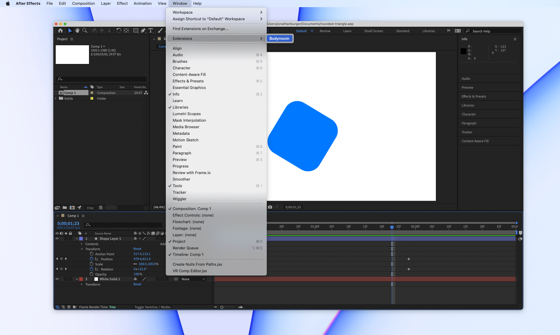 In the After Effects menu, go to Window -> Extensions -> Bodymovin