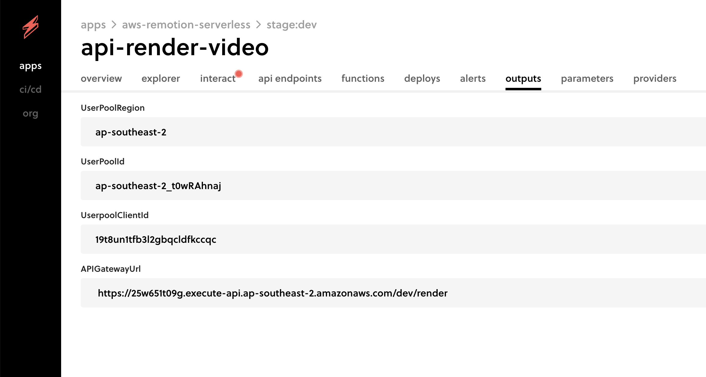 The API requires an authorization token to interact with it. To obtain the token, first go to the serverless dashboard to retrieve outputs such as UserPoolRegion